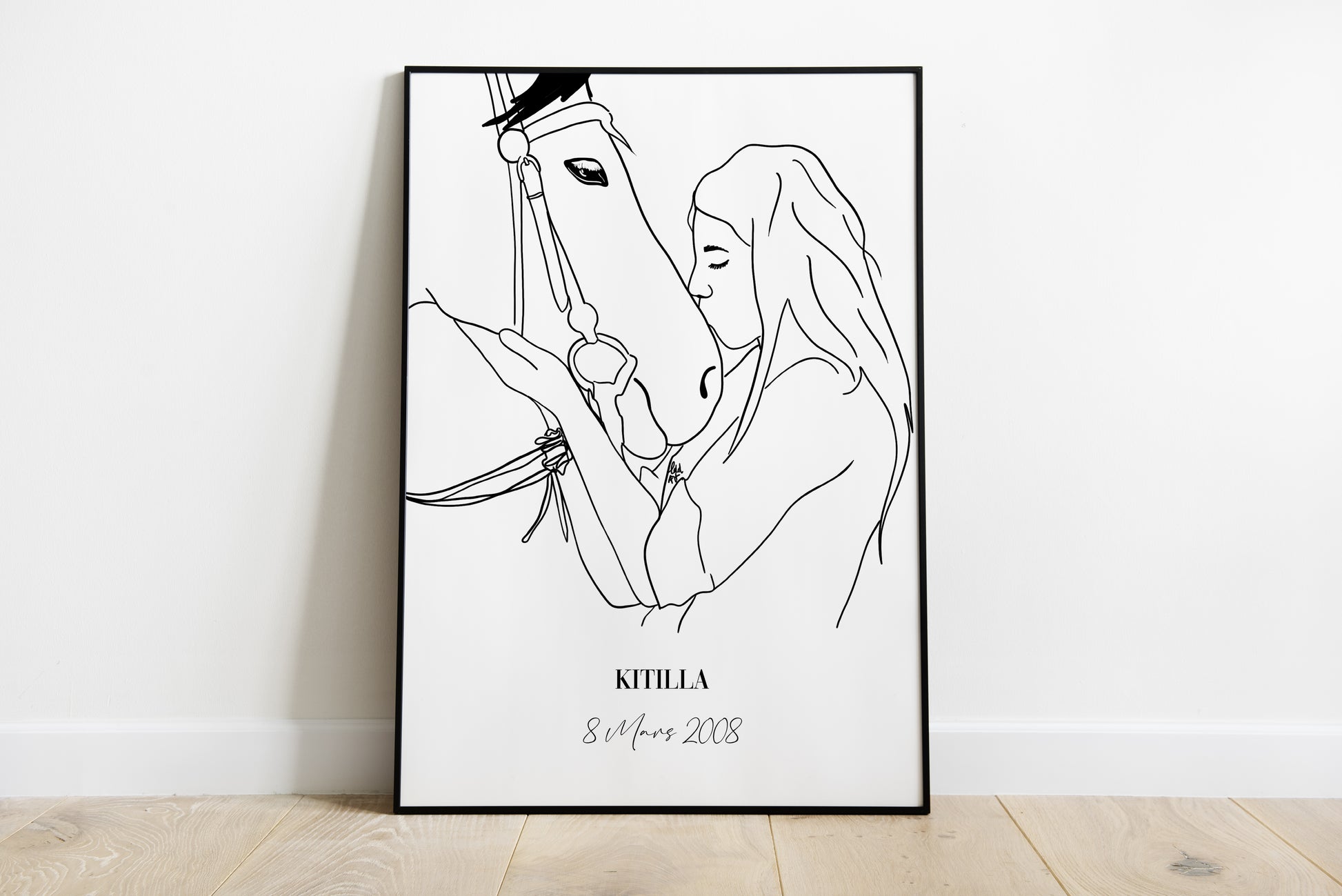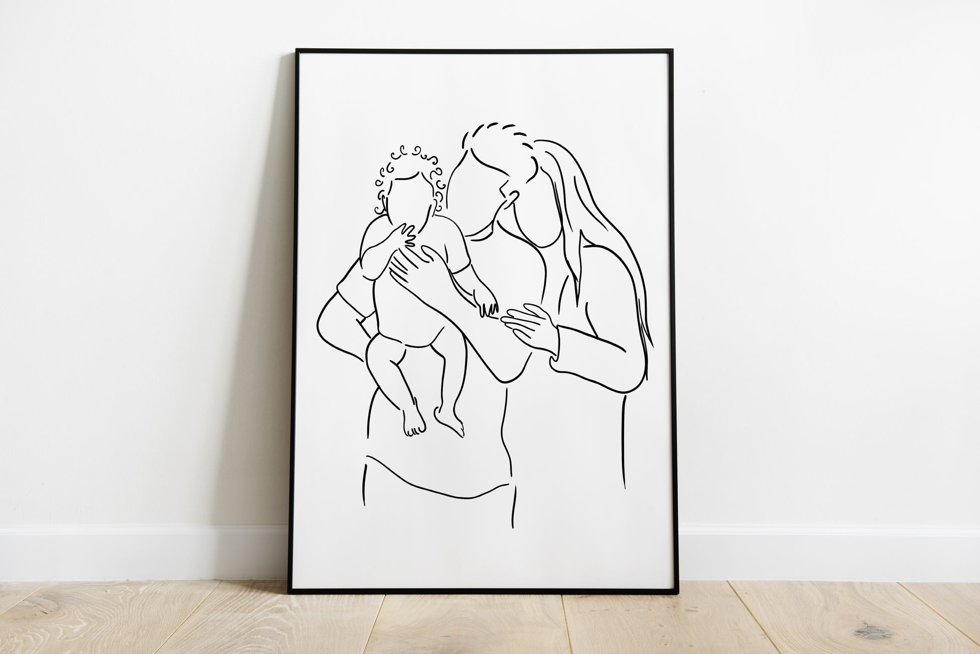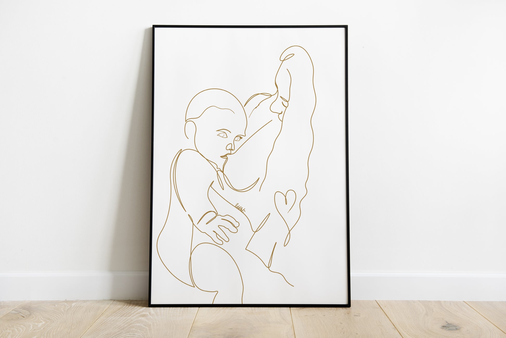 L'illustration "ligne" est une illustration réalisée à partir de votre photo, elle est à votre image mais ne comporte pas les détails de visages et de vêtements. (yeux, bouche, nez, ombrages...)